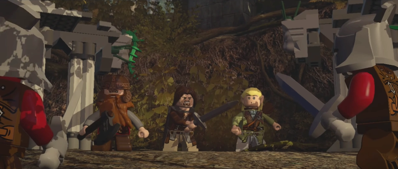 From Aragorn, Gimli and Legolas' perspective, destroy some pallets on the right, near the Rowing Boat, to get a torch. Light it on fire from a campfire on the left side of the place and use it to burn the logs blocking your path. Switch to Legolas, jump as high as possible to reach the highest platform and follow the vines to the tree branch. From its highest point, shoot at a target, knocking down a bird's nest. With the remaining bricks, build a trampoline thanks to which the whole team can reach higher. A little further on, use Gimli's axe to create a passage. You will find a difficult puzzle. Go to a broken slab on the ground to the left with Gimli, jump and press the attack button just in time to destroy it and build a platform. To the right, grab Gimli with Aragorn or Legolas and throw him at a broken tile on a pillar to destroy it. Climb the broken statue with Legolas, shoot an arrow into a gap to create a handhold that will take you to the platform above. There, push a pillar down to create another platform. Then push both platforms so you can jump from the smaller one to the larger one from there to the rock ledge at the background. Once again, use Gimli's axe to destroy two broken tiles. The second tile will require you to cast Gimli. Destroy the remains of the rubble, use the bricks to build a hole, and shoot an arrow with Legolas to create a handhold. Use Legolas to grab the handhold from the log and reach the other side. There, build a small pillar with the bricks from the rubble and push it down so the other characters can join the Elf. Take Frodo's sword with Aragorn and trace the footprints on the ground to locate the hobbit. You'll know you're close when Aragorn starts searching on his knees. You'll know you've found it when Aragorn begins digging in the ground, ending the prospect. You'll move on to the next area when you're done with both perspectives.