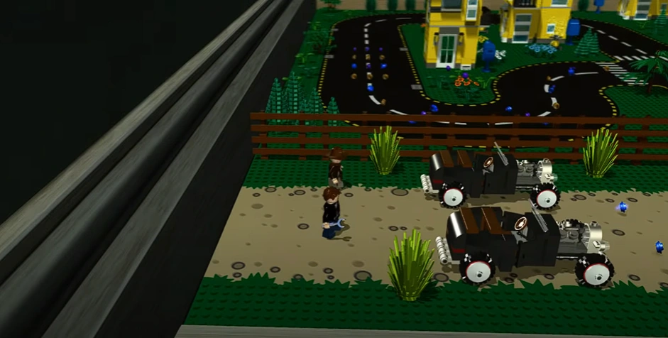 You start out on a road with two Hotrods. You can ride one of them to destroy most objects and get studs. There are several mailboxes that if you hit them they will open and give you studs. There is a trampoline near a tricycle that you can bounce off to get studs. When you get to four hundred thousand studs, the blue steps on the right will turn into a ramp. You can use a Hotrod on the ramp to get to an upper area where there will be a lot of valuable studs. Be sure to destroy every item you see on the level and grab the loose studs for more. The level will end as soon as you reach one million.