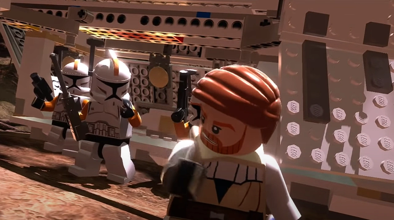 In the next area, move forward and pull the lever to open the second cell on the left. Then continue forward and pull the lever on the left at the end of the hallway. Return to the previously opened cell and use the grappling hook of one of the troopers on both grappling points on the wall on the right. Once you reach the next cell, destroy the silver stones on the right with Waxer's bazooka. Then use Obi-Wan's lightsaber to create a hole in the wall on the right and use the Force to push the large brick. After pushing it towards the door, it will turn out that the floor has been damaged in two places. However, if you look to the right, you will see that two parts are missing next to the wall. Use the Force to place them on the purple points, push the brick to the end, jump on it with a soldier and use the Clone Trooper panel. Inside the next location, approach any of the cannons and continue attacking it until the crew abandons it. Then go in and start destroying the weapons on the hill in front of you. Repeat this maneuver on the other side of the canyon to destroy all three cannons. A silver AAT will come out from behind the wall. Cross its force field on foot and deactivate it by pulling the lever on the right behind the AAT. Then return to the cannon and fire the AAT using it. Once it's damaged, approach the blue symbol in front of it with Obi-Wan, stay there, and attack the AAT to end the level.