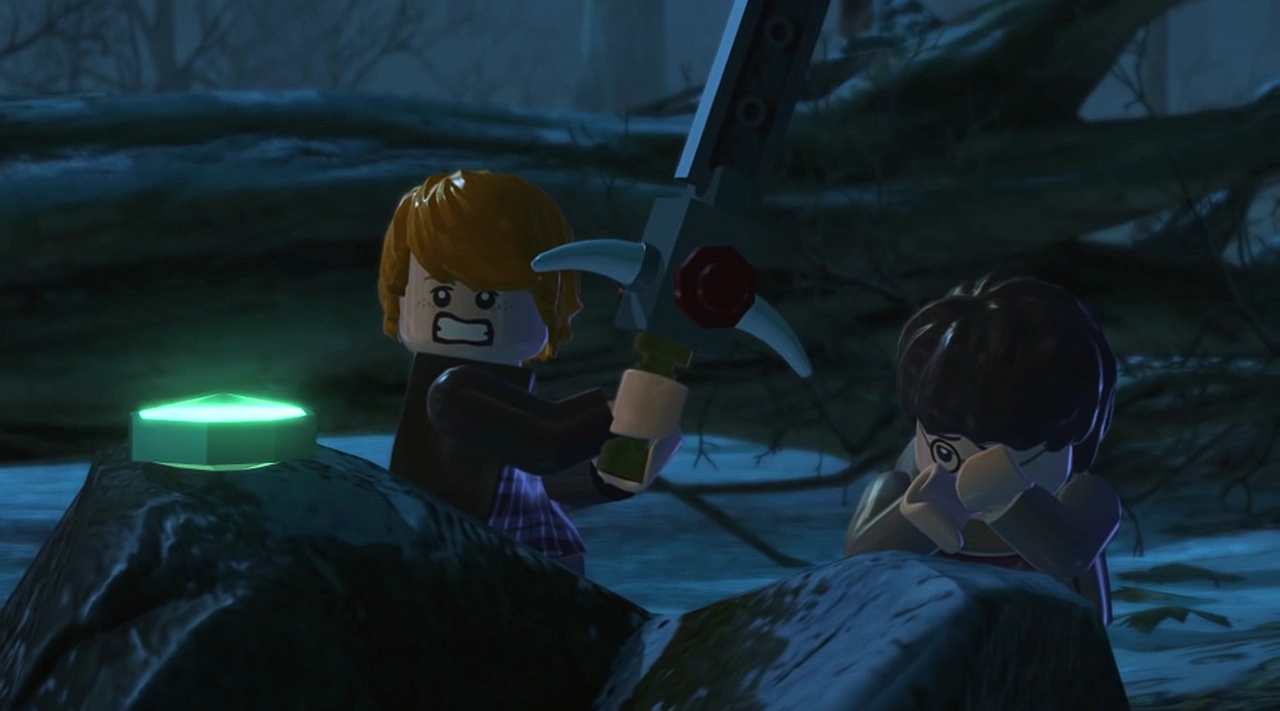 You start in a frozen pond. You have to find the sword necessary to destroy the Horcruxes. Move to the bottom and place a blue octopus arm on the ice cube (use the Wingardium Leviosa spell). After it breaks, you will find a swordfish that you can use to make a hole in the ice below you. Swim to the bottom and then to the left. Use the Wingardium Leviosa spell to move the vines away. At the bottom, you must open a geyser with one character, so that the other character can swim behind the rock. Once you reach the other side, you will have to close the geyser and release a gigantic crab. This will allow you to swim further to the right. On a rocky ledge you will find a yellow fruit. Attach it to a rope. Another fish will drop some bricks. Create a hammer with the bricks and use it to break the ice - you will find the Gryffindor's sword and move on to the next area.