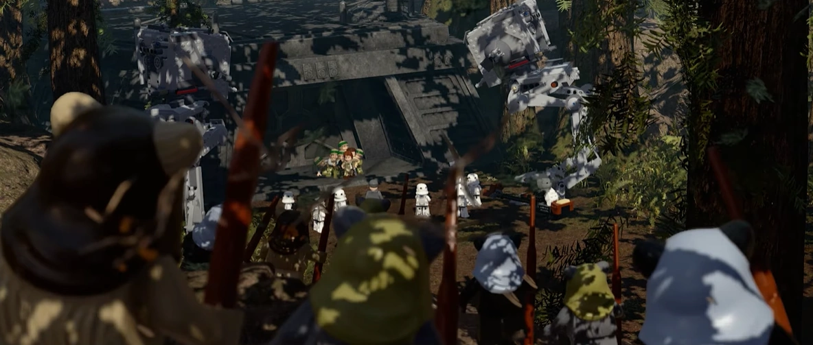 Wicket shows Leia, Han, Luke, Chewie and C-3PO a shield generator, which secures the Death Star II from exploding. Their goal is to destroy it and defeat the empire. In the front of the base there is a Scout Trooper. Han tries to get his attention by throwing small rocks on him. This makes the Scout Trooper confused. Chewie then throws a big rock at him. The rebels try to break into the base, but they get encircled by the Imperial forces. Wicket then calls for help and an army of Ewoks attack the Imperial army. Meanwhile, Chewbacca goes with Wicket to capture an AT-ST. Later, Wicket constructs a Breaker Blaster and uses it to break a wooden wall, blocking their way from going further. After some walking they also get stuck by a concrete wall. Unexpectedly, an Ewok flies into a cannon, which makes some blocks fall out of the cannon. They build a big horn from them to attract an AT-ST, which destroys the wall. Wicket then constructs a net thrower. On they mountain, they open the door by putting the batteries in the energy collector. Later, Wicket constructs a glider. They fly on the top of AT-STs and hijack them. They save the rebels and the shield generator is blown up. Meanwhile Luke Skywalker is captured by the empire and taken to the Emperor.