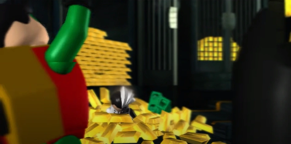 In the Batcave, Robin opens all the boxes and builds the Eiffel Tower, but Batman destroys it, implying that it wasn't the right place. He then builds another place that Robin doesn't know what it is, but Alfred types into the Batcomputer and shows the Gold Reserve, hinting that this was the right place. The heroes then head there and meet up with The Riddler and Two-Face. Two-Face then confronts them and destroys a lid to release acid, but Batman and Robin cross it thanks to the help of a ship and he escapes. While the Riddler and Two-Face thought they had done their job, Batman and Robin find them and after a huge fight, they defeat them and gold falls on them. Robin celebrates victory, but Batman tells him to stop. The Riddler and Two-Face are then taken to Arkham Asylum.