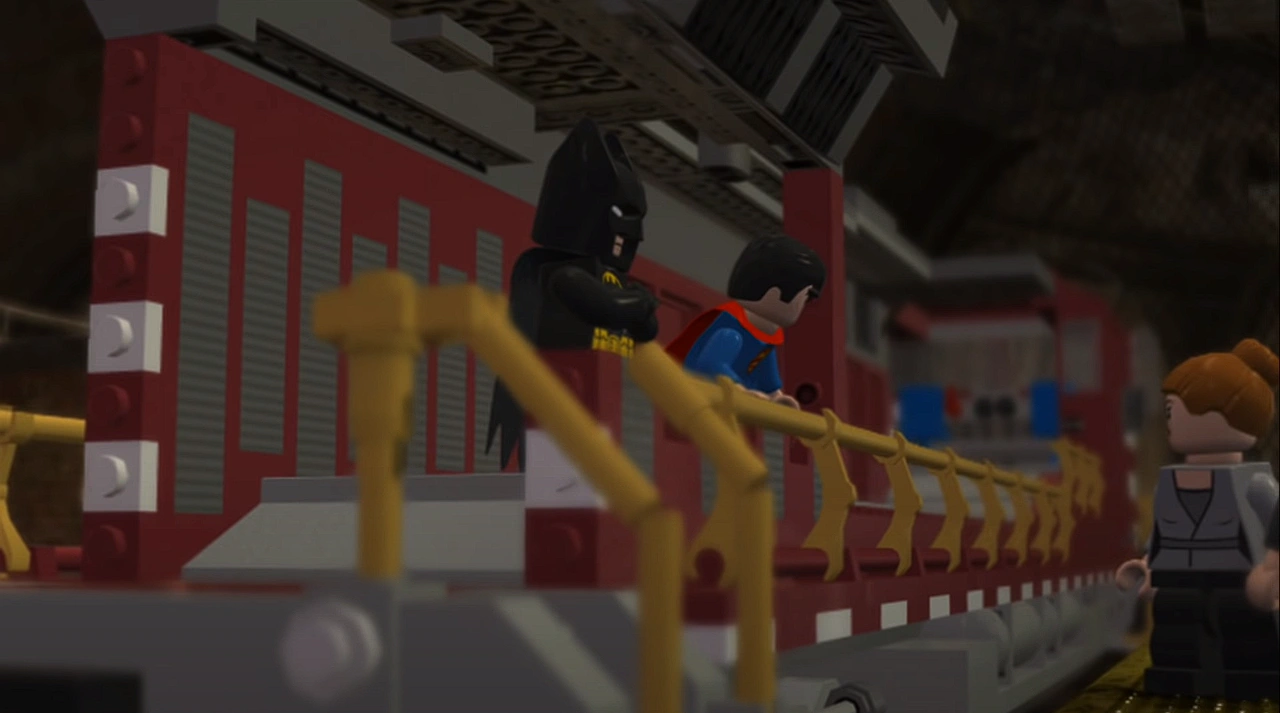 In the next area, go left, defeat enemies, use explosive rockets to destroy three silver boxes, and use the bricks to build a machine with a lever. Pull it to reveal bricks and use them to build a panel with the Bat Suit for Batman. Move forward towards the rails, where you will see glass bricks on the wall. Destroy them with Batman's wave gun and use Superman to freeze the dripping water. Climb up as Batman and use the Bat Suit to glide to the platform on the right. Use the wave gun to destroy a glass brick blocking the ladder near the wall. Then pull a lever to turn off the green light above the rail and turn on the red one. This way you will get the train to separate from the cars and make the second one stop. Get off, use Superman's laser to destroy a golden object, and build an orange handle on the train car. Pull it with the same character until the Joker Robot grabs the car and passes it to the other side. When the scene ends, move down the hallway and eliminate enemies. At the part with a railroad crossing, move to the left and put out the fire using Superman's Freeze Breath. Destroy the stones and use the stairs to climb to the ledge. Then switch to Batman and glide to the middle ledge and then glide to the right one. It can be a little difficult, so you will have to hold on to the handholds. Use the wave gun to destroy a glass brick blocking the stairs, go up the stairs with Superman and check the green wall to your right with X-Ray Vision. Move three red valves with the attack button to cut the electrical power. Get off, go down the tunnel and use Superman to pull an orange handle and continue marching down the tunnel. When you continue marching, the Joker Robot will grab you and you will move on to the next area.